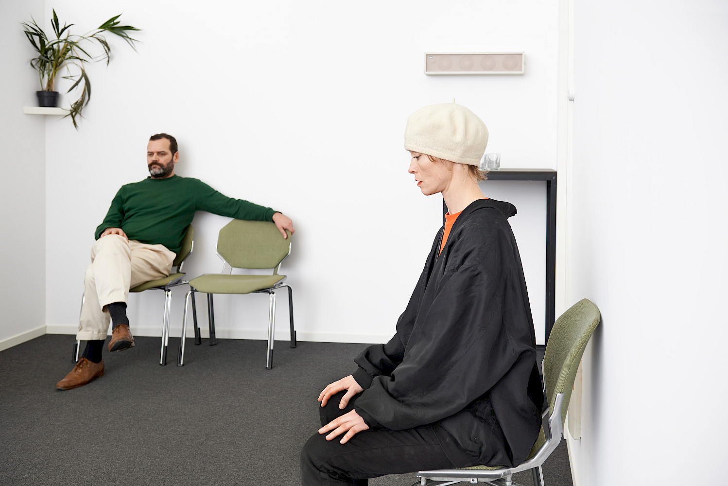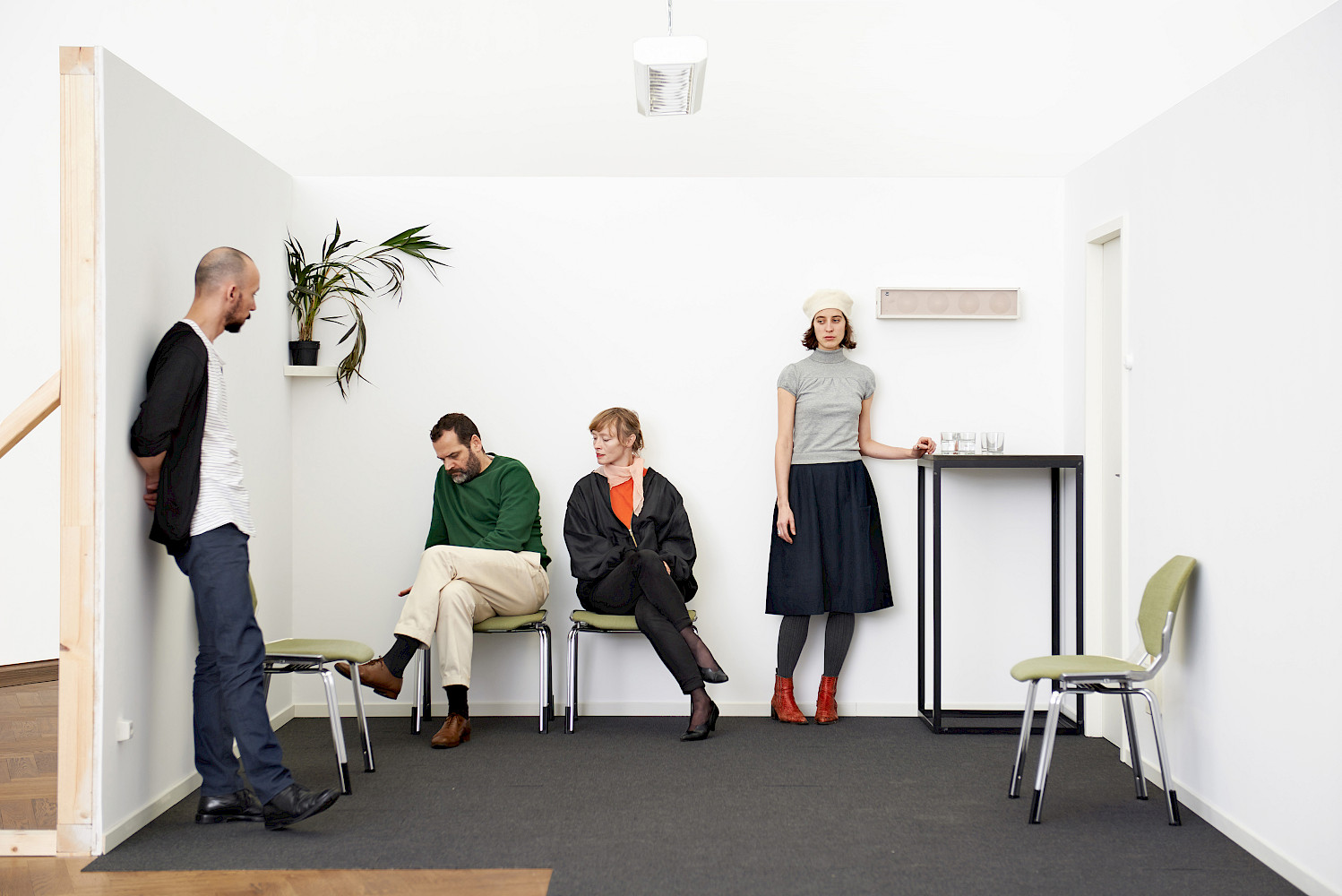 All The Players is a durational performance viewed in parallel with the reading of a script. The script is in future tense. It relates to a scene featuring three characters, which is enacted by five actors - the roles double up, and interchange. The text details their actions, and indicates their thoughts and state of mind. The scene is a power game of sorts between a set of potentially precarious characters.