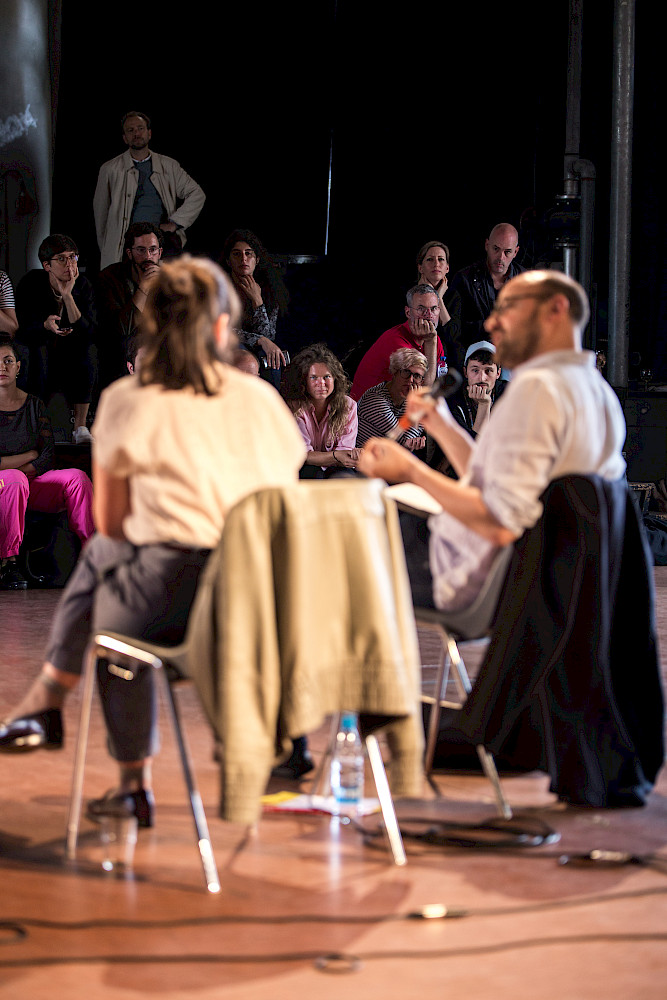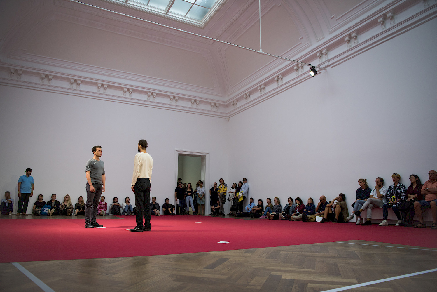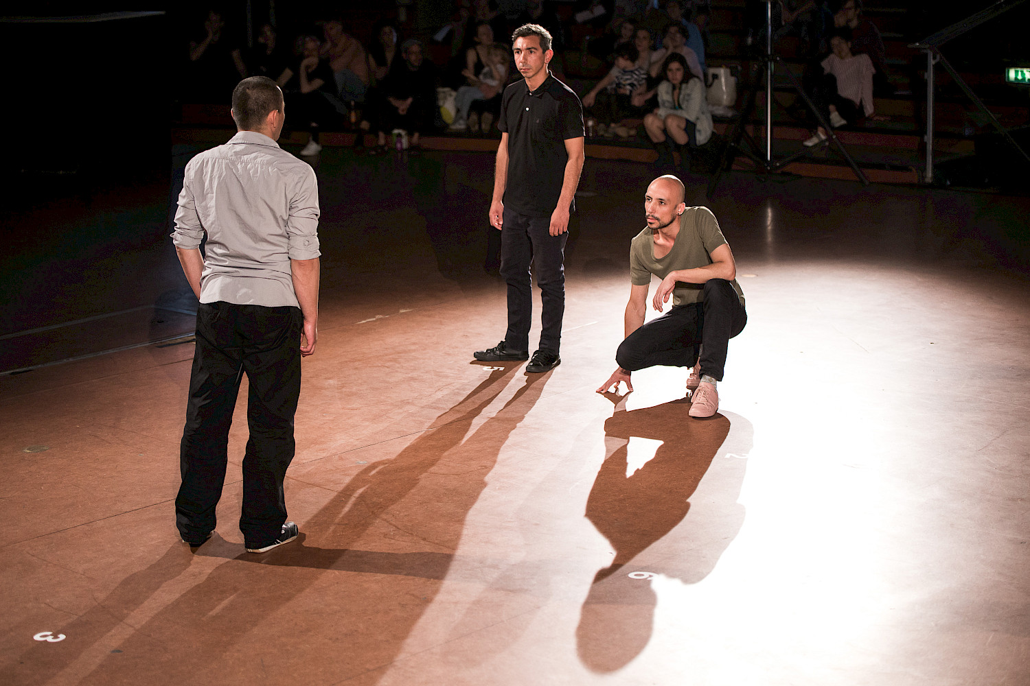 A pre-recorded male voice recounts a seemingly significant occurrence. Three male performers enact the script, keeping in line with the voiceover’s direction. There are three protagonists - the man, the other man and the third man. What seems to have happened between them is never fully revealed. The gestural vocabulary evokes a range of possible narrative lines – rivalry, an erotic encounter, confrontation, violence, cooperation – none of which ever crystalize. The moment an image begins to stabilize, it dissolves, erases itself and transform into another.