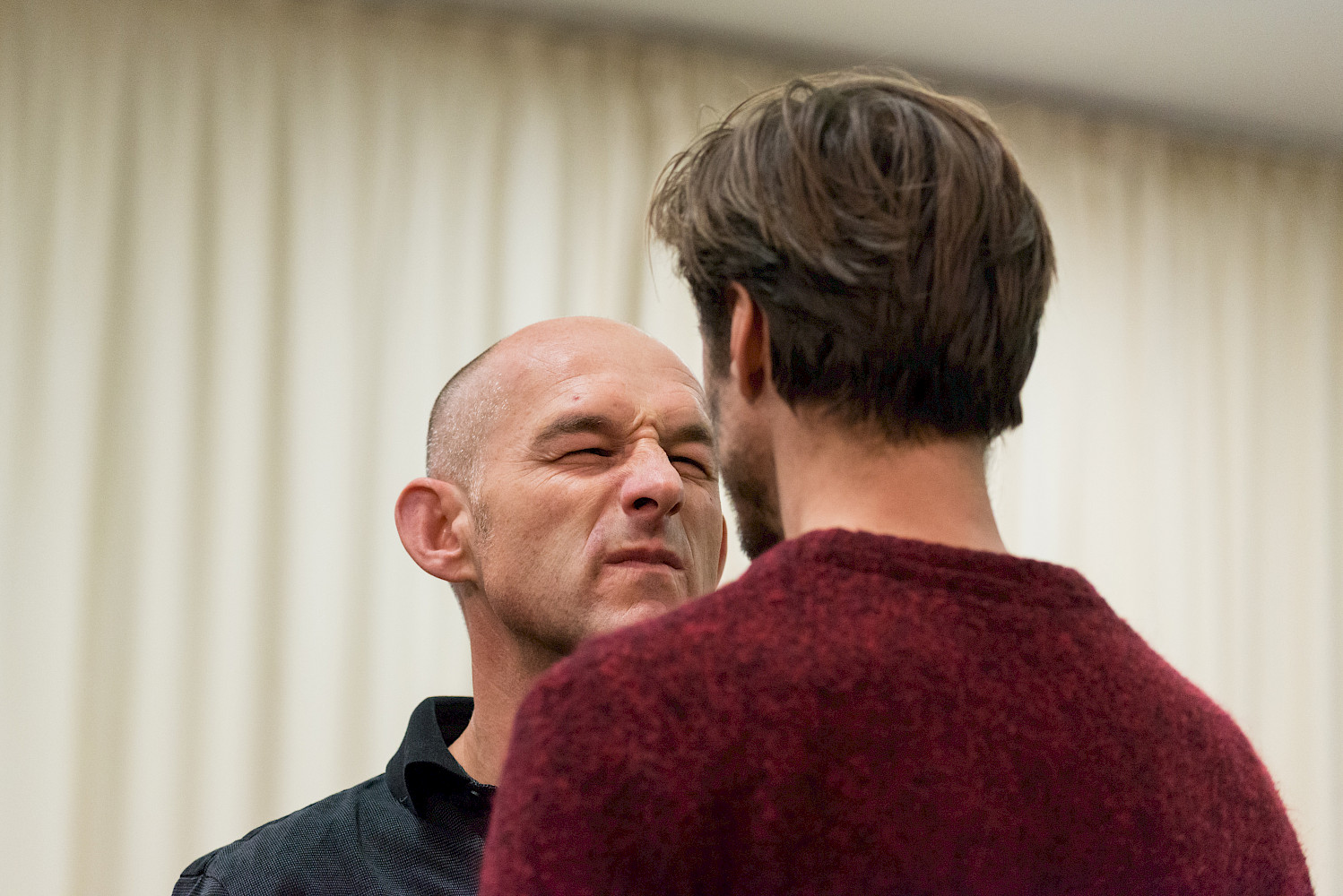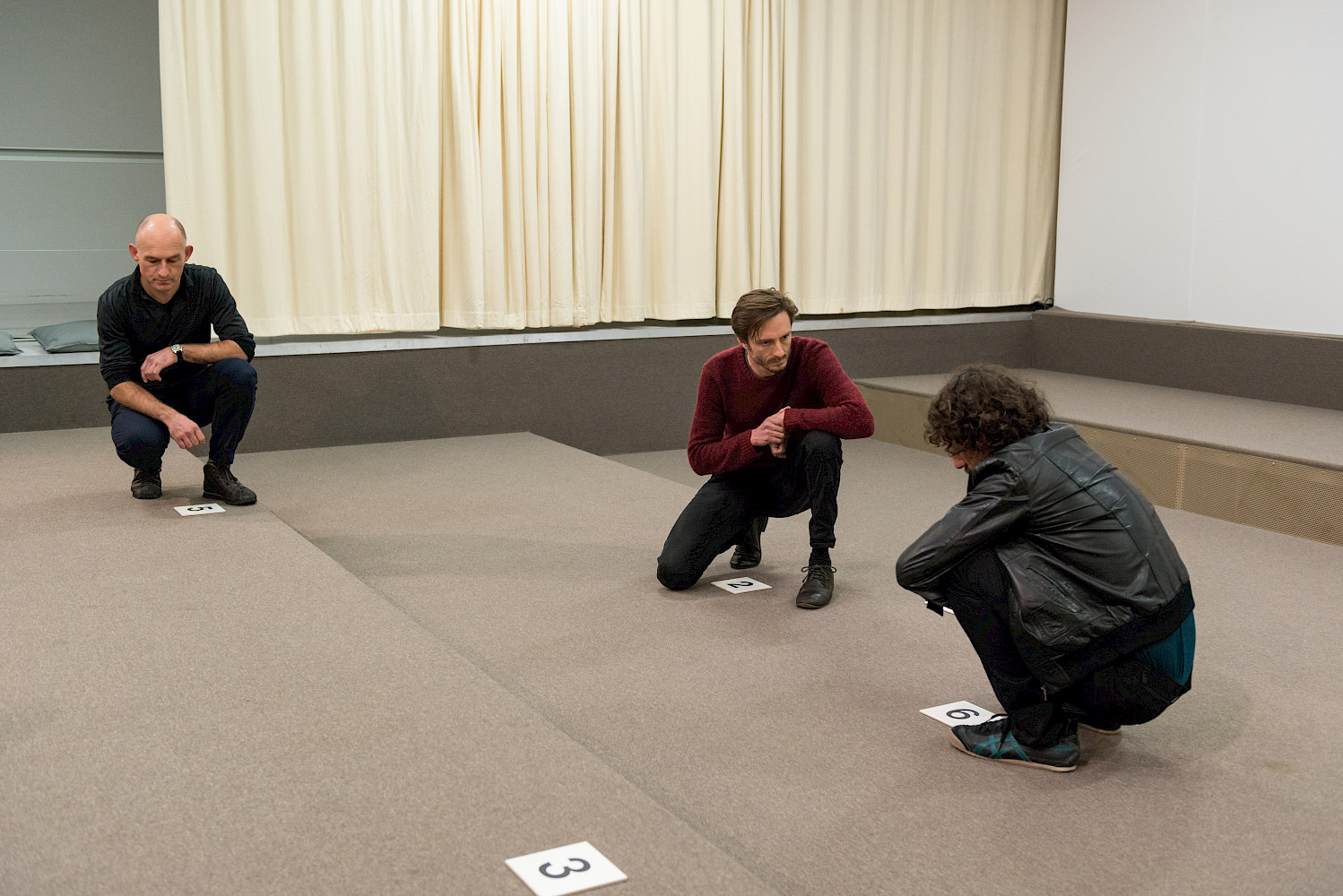 A pre-recorded male voice recounts a seemingly significant occurrence. There is a man, another man and a third man. The men are unrehearsed, they receive a briefing in advance and do their best to keep up with the voice’s words. Several forces are at play simultaneously. The roles are continuously shifting and distinctions fade. What we see and what we hear falls in and out of synch.