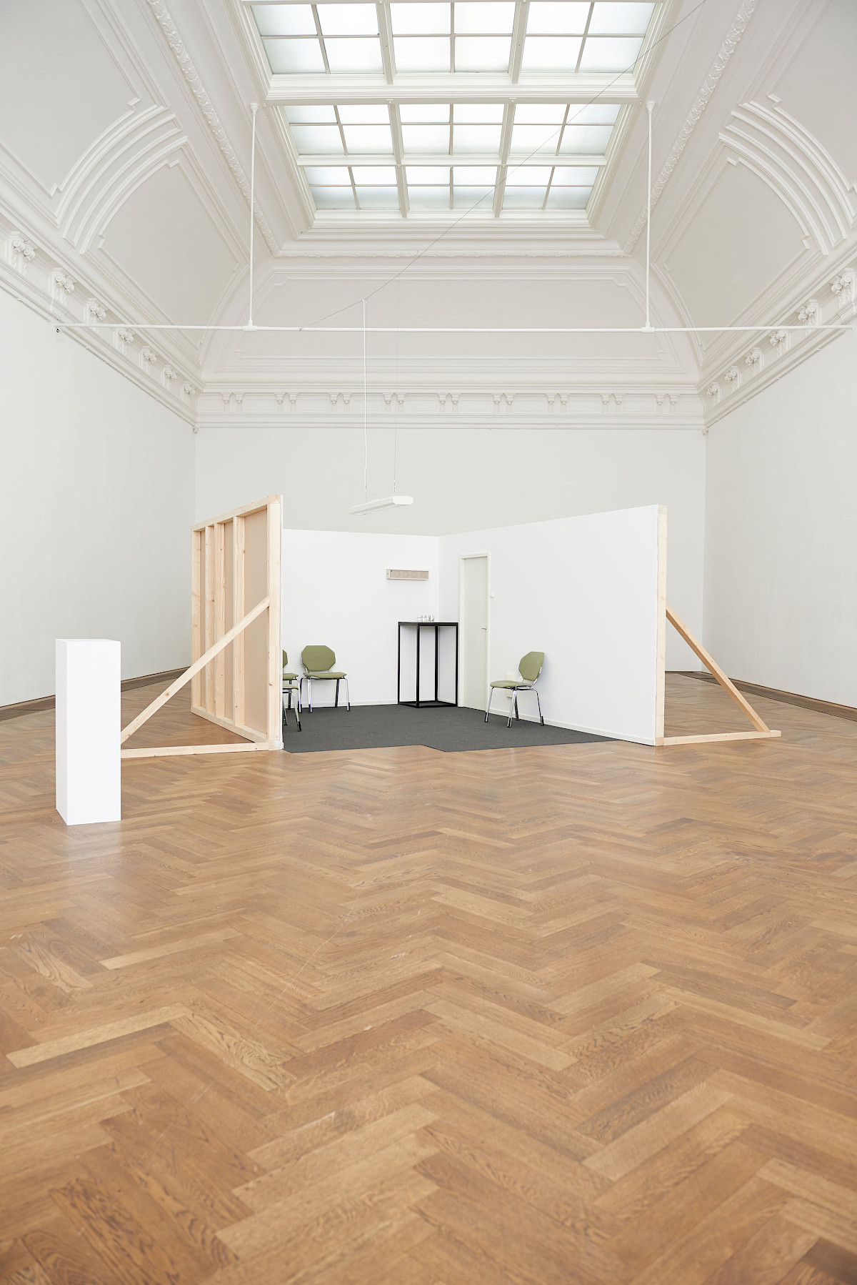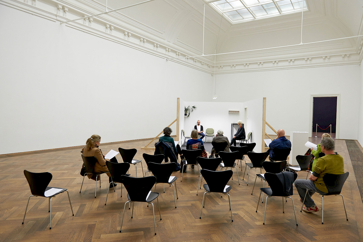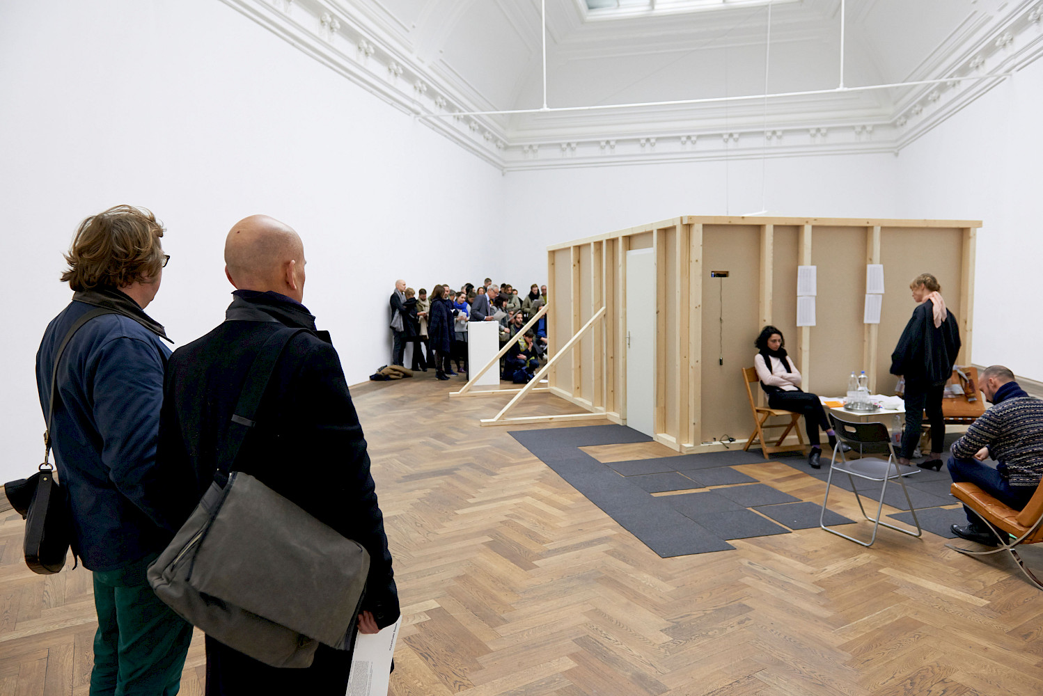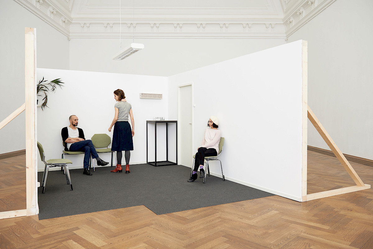 All The Players is a durational performance viewed in parallel with the reading of a script. The script is in future tense. It relates to a scene featuring three characters, which is enacted by five actors - the roles double up, and interchange. The text details their actions, and indicates their thoughts and state of mind. The scene is a power game of sorts between a set of potentially precarious characters.