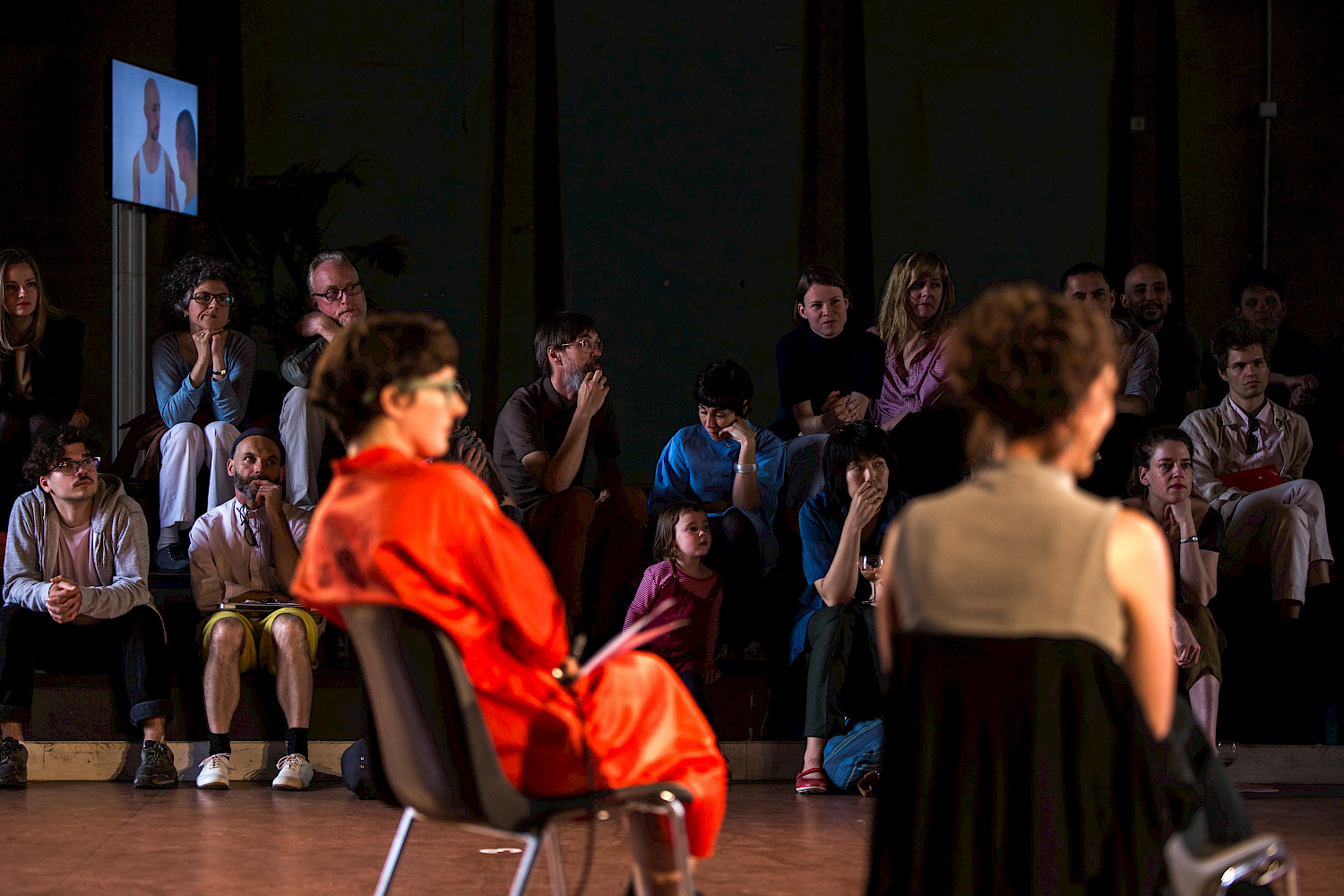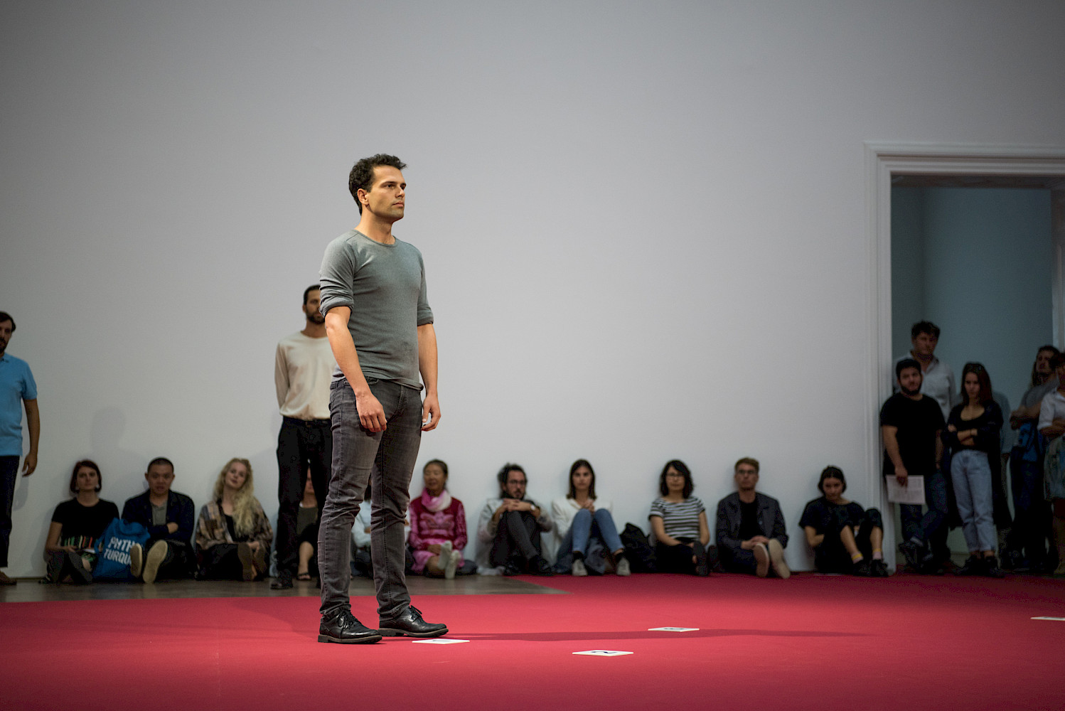 A pre-recorded male voice recounts a seemingly significant occurrence. Three male performers enact the script, keeping in line with the voiceover’s direction. There are three protagonists - the man, the other man and the third man. What seems to have happened between them is never fully revealed. The gestural vocabulary evokes a range of possible narrative lines – rivalry, an erotic encounter, confrontation, violence, cooperation – none of which ever crystalize. The moment an image begins to stabilize, it dissolves, erases itself and transform into another.