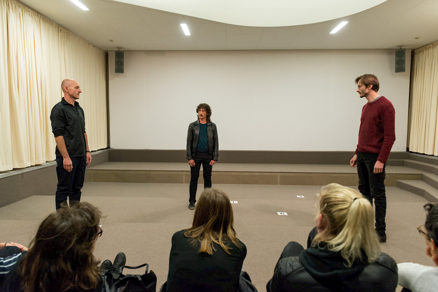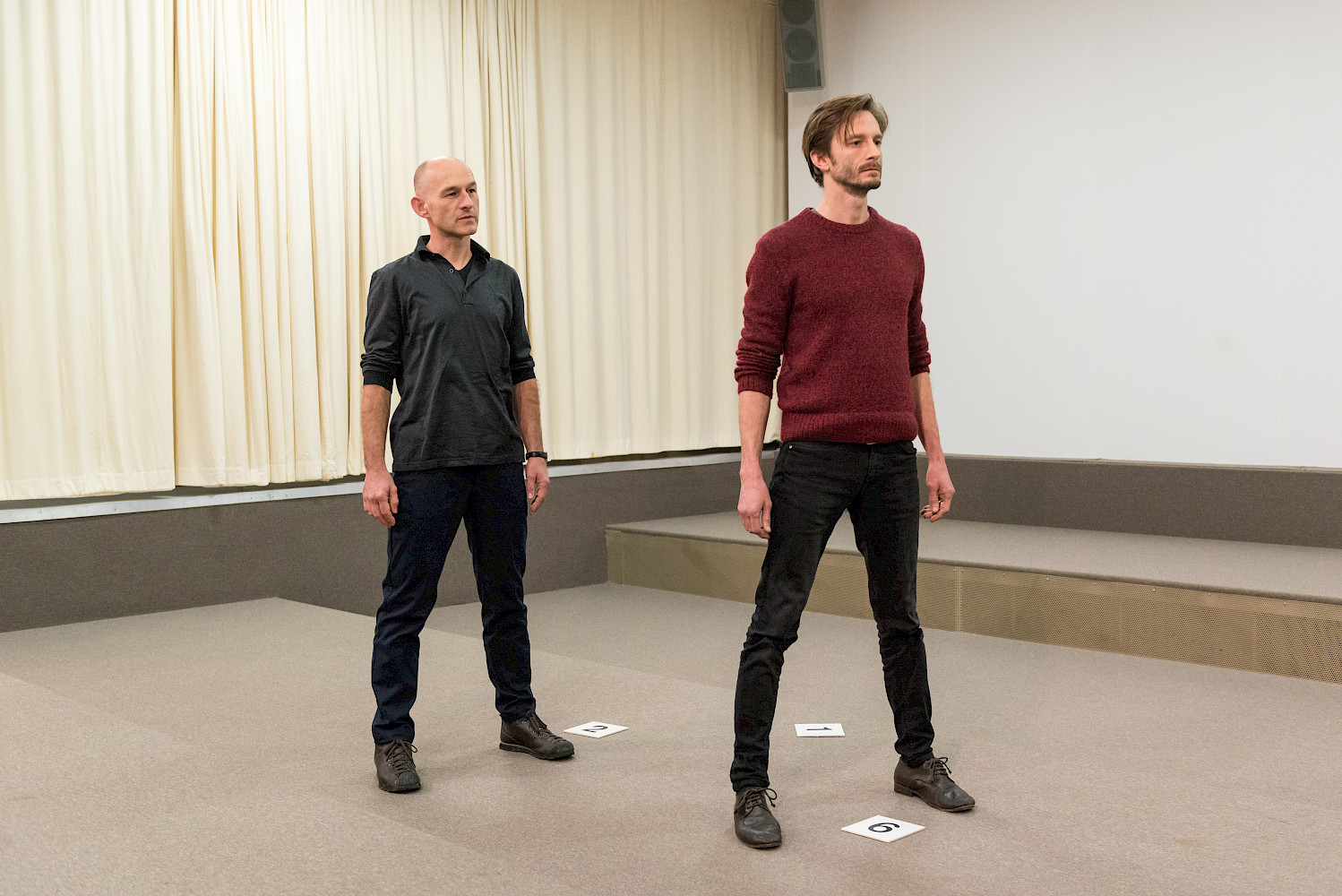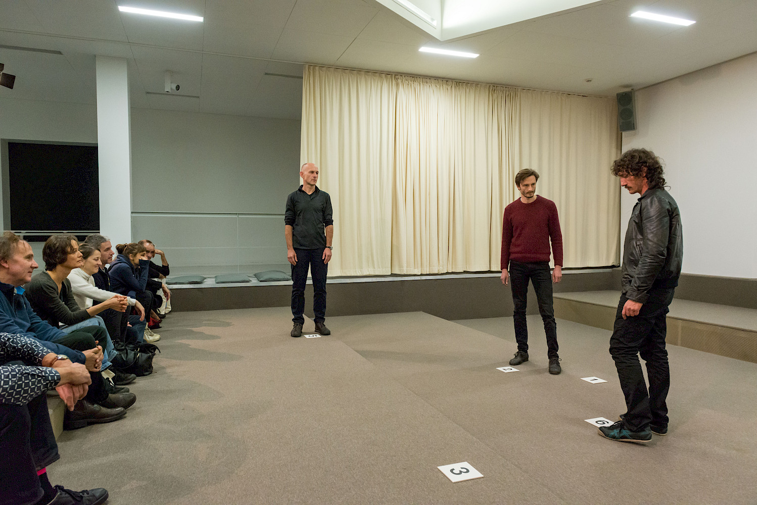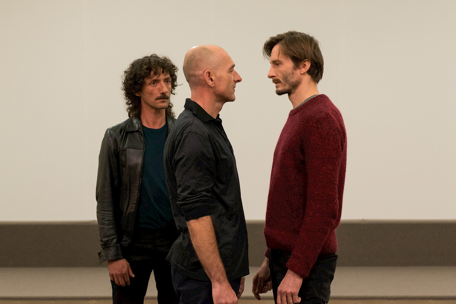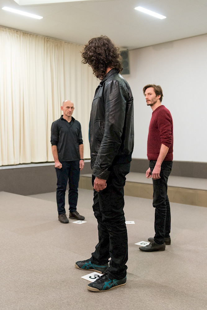 A pre-recorded male voice recounts a seemingly significant occurrence. There is a man, another man and a third man. The men are unrehearsed, they receive a briefing in advance and do their best to keep up with the voice’s words. Several forces are at play simultaneously. The roles are continuously shifting and distinctions fade. What we see and what we hear falls in and out of synch.